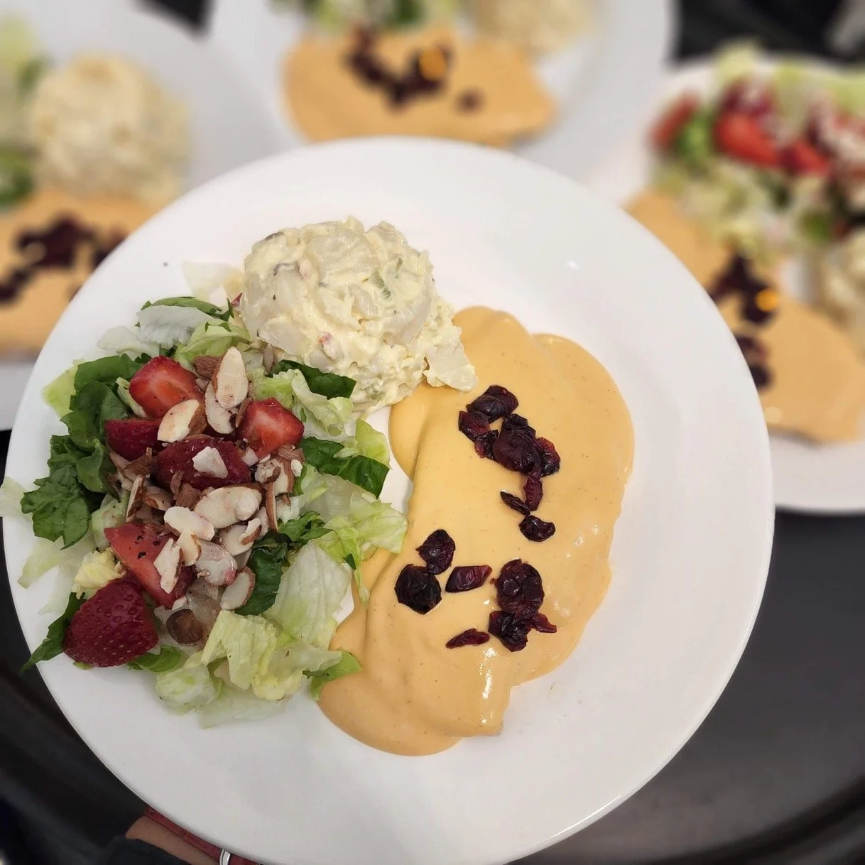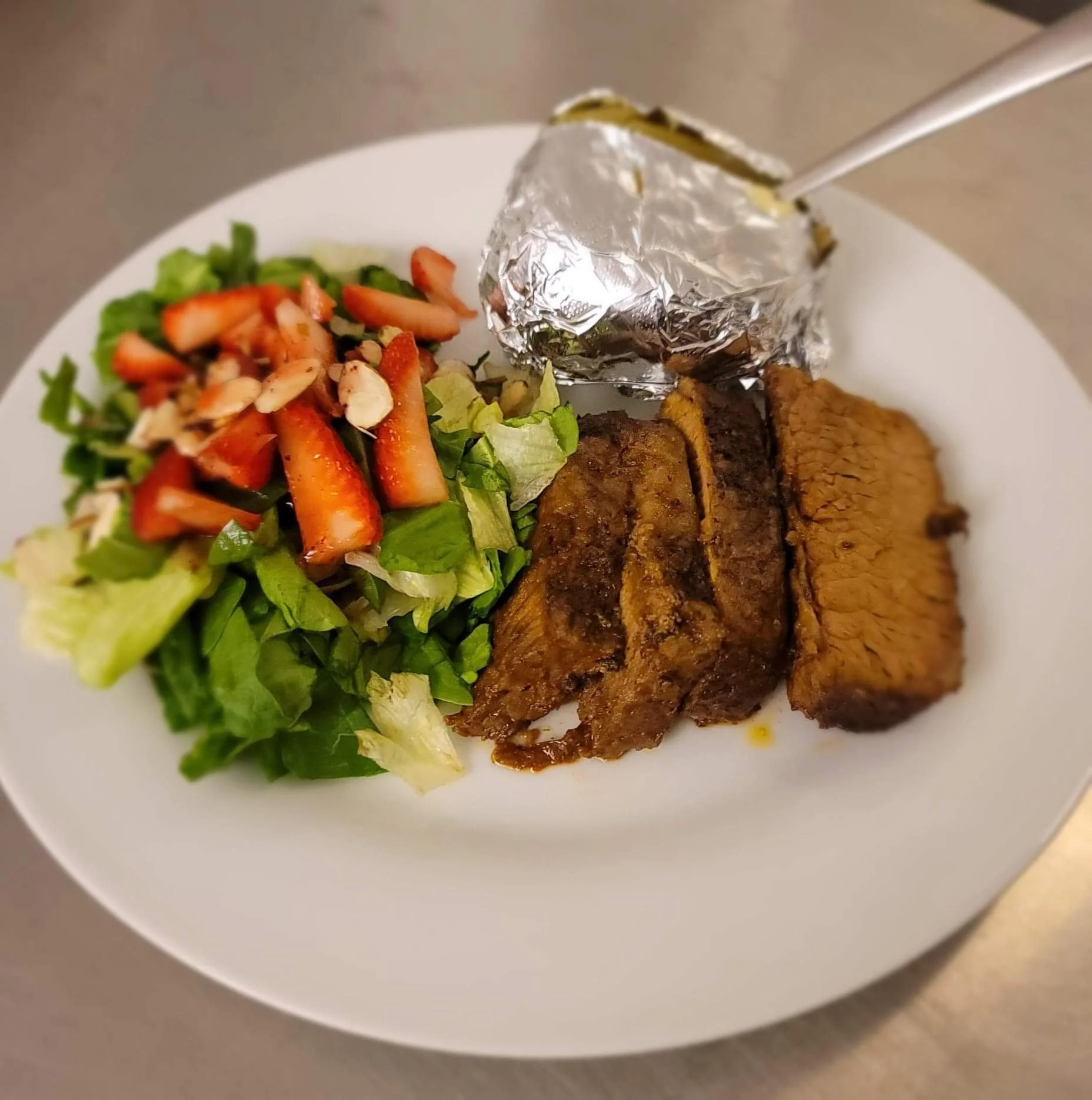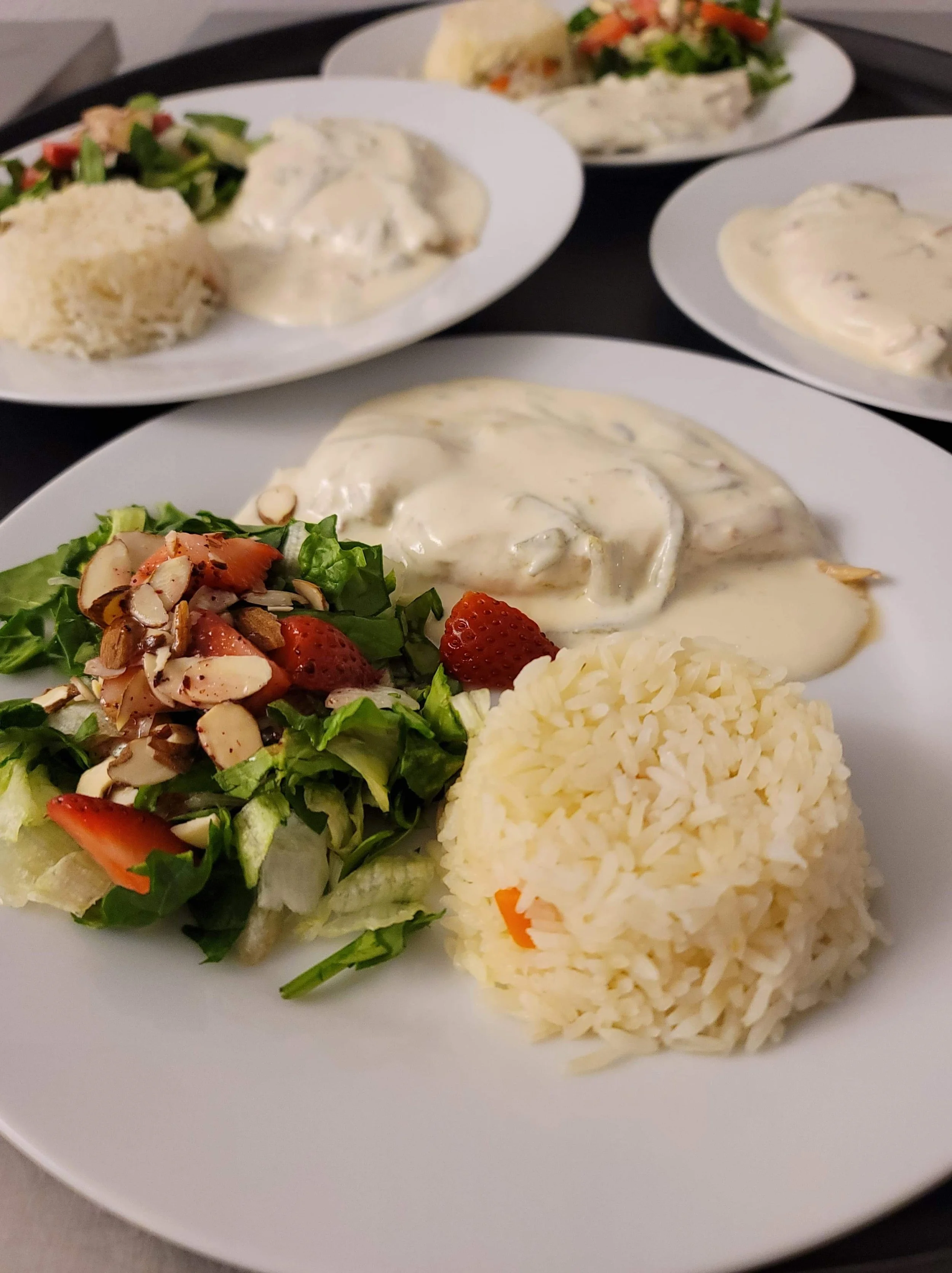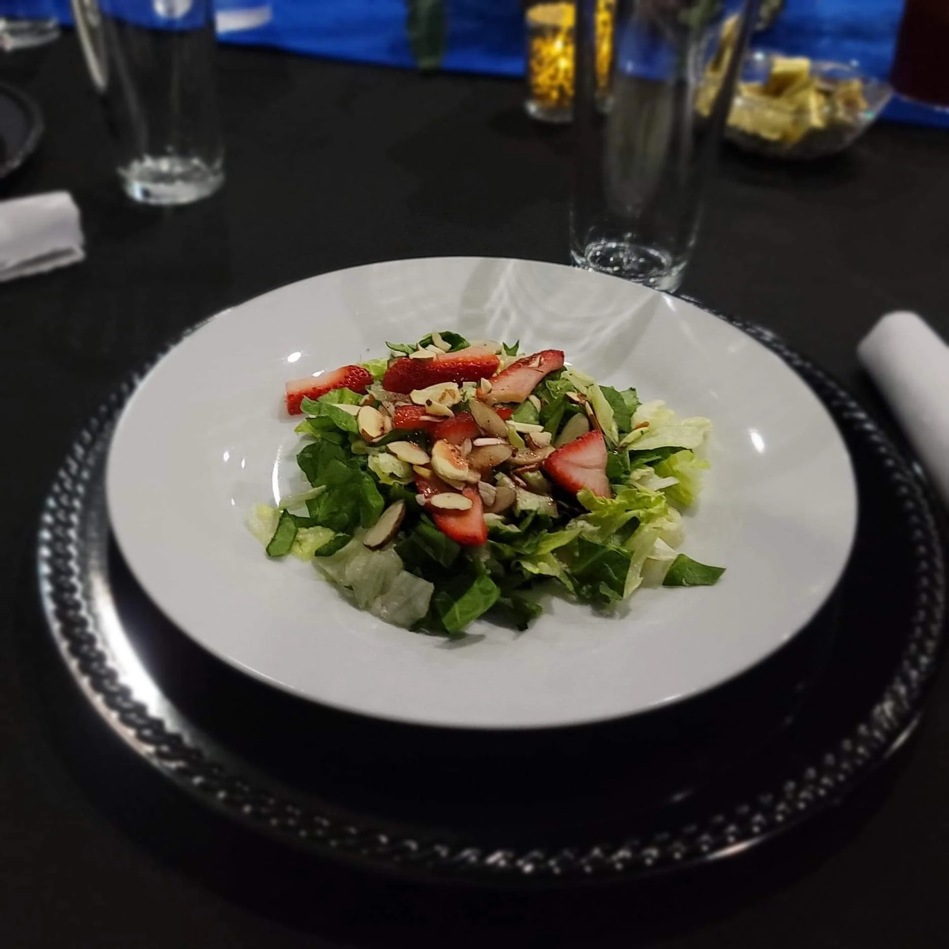 The Course Service is split into two, first you are served the salad on a small porcelain plate and then you are served your entrée with your chosen side on a porcelain 10” plate. This service also includes white or black napkins with a diamond ring, stainless steel cutlery and individual bread.